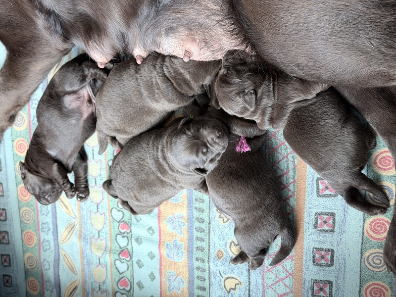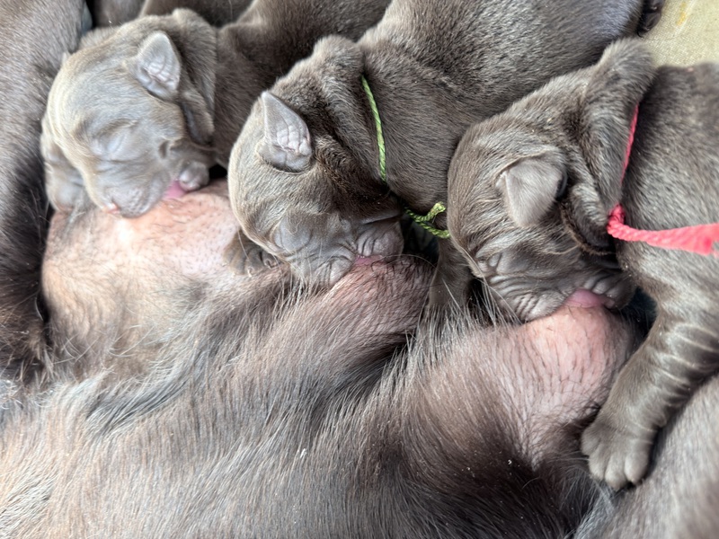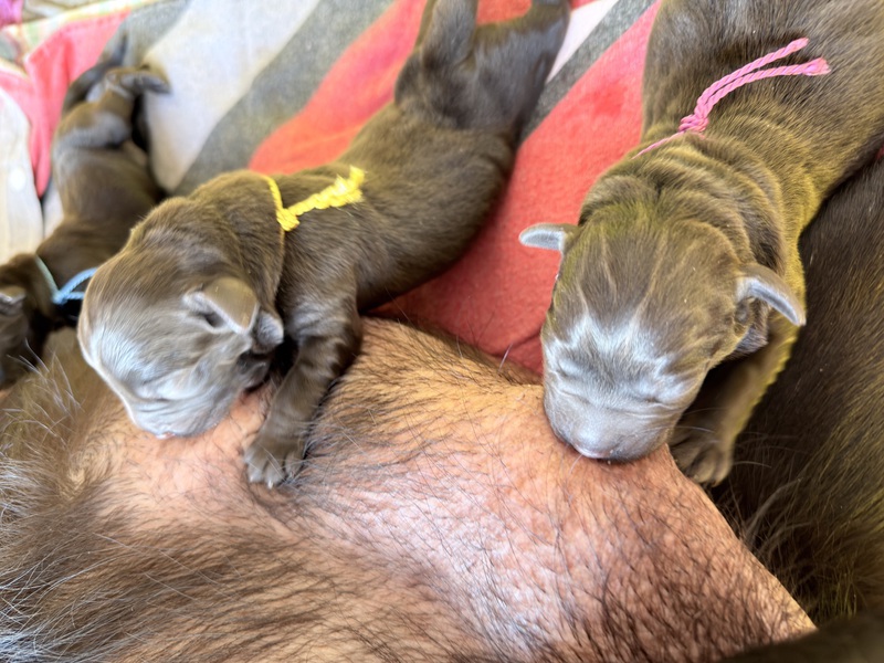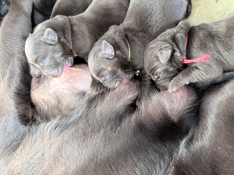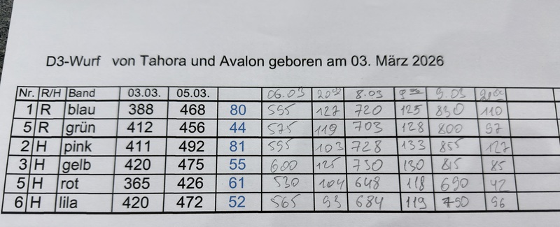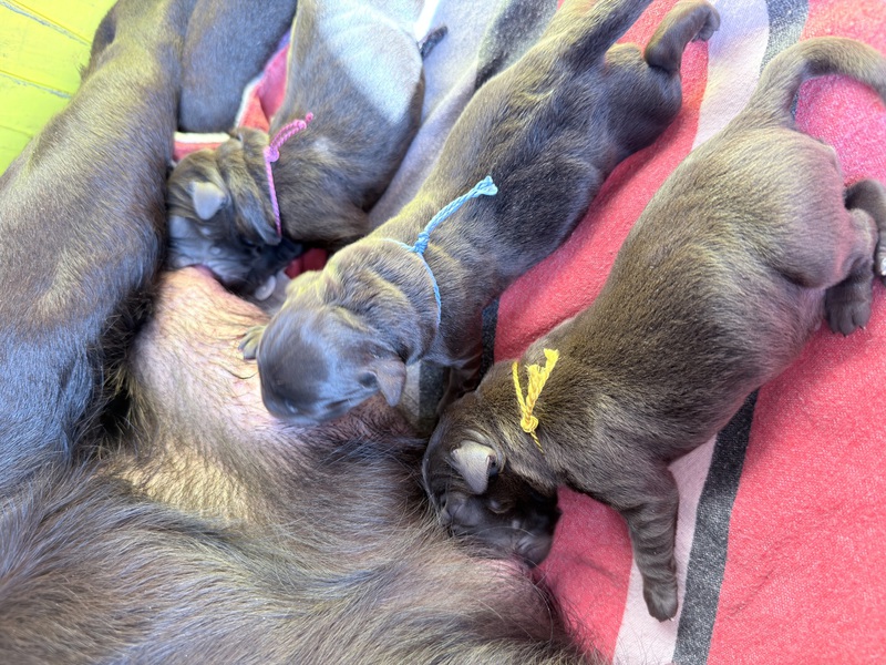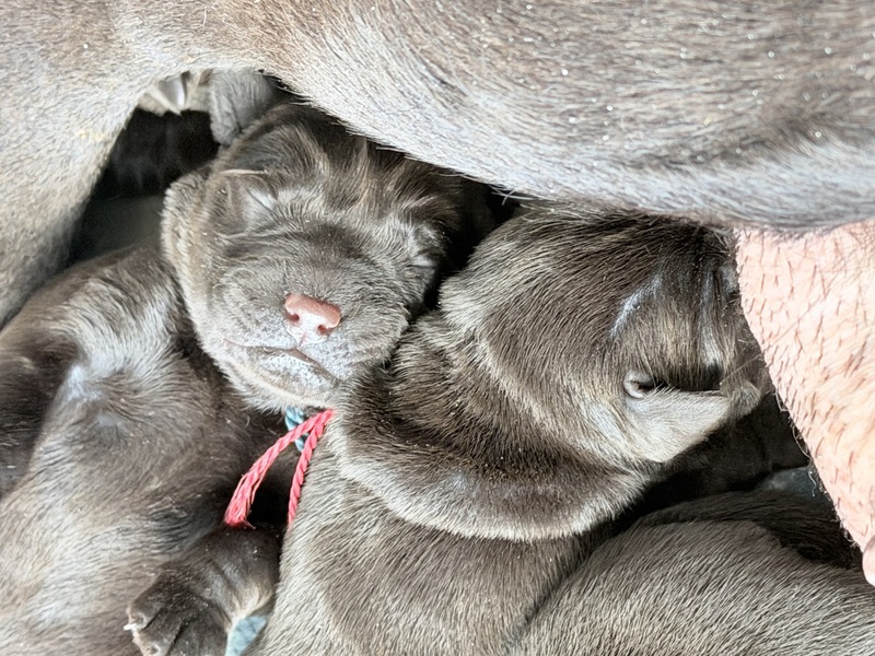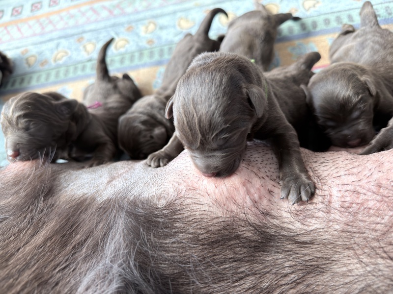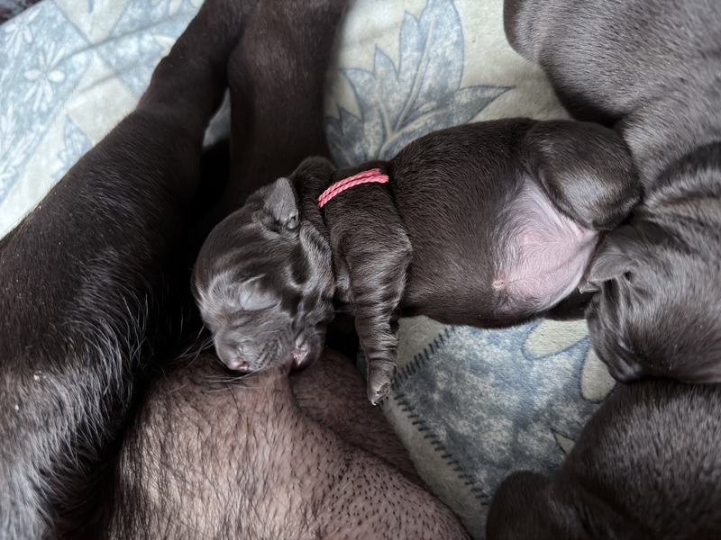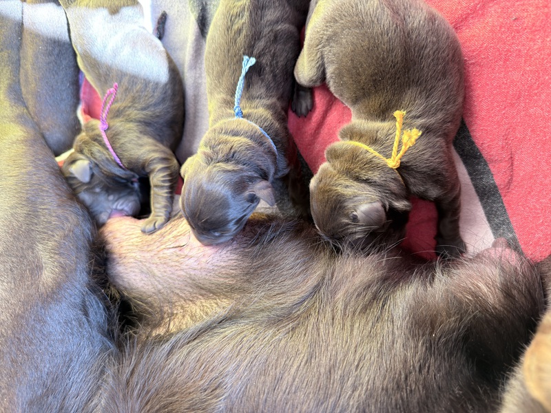 Unsere Welpen sind gestern gesund und munter auf die Welt gekommen! Mama und den Kleinen geht es sehr gut. Jetzt heißt es vor allem: trinken, schlafen und wachsen. Das Wichtigste in den ersten Tagen ist eine gute Gewichtszunahme – und das klappt momentan ganz wunderbar.