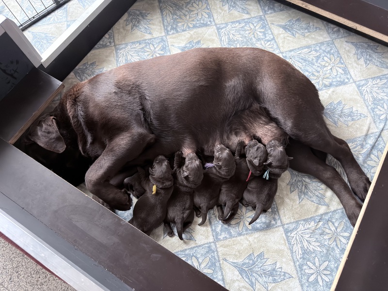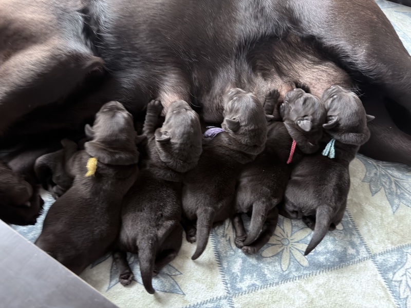 Alle Kleinen nehmen täglich schön an Gewicht zu und verbringen ihre Zeit momentan vor allem mit trinken, schlafen und wachsen. Mama kümmert sich sehr liebevoll und aufmerksam um ihren Nachwuchs und versorgt die Welpen bestens.