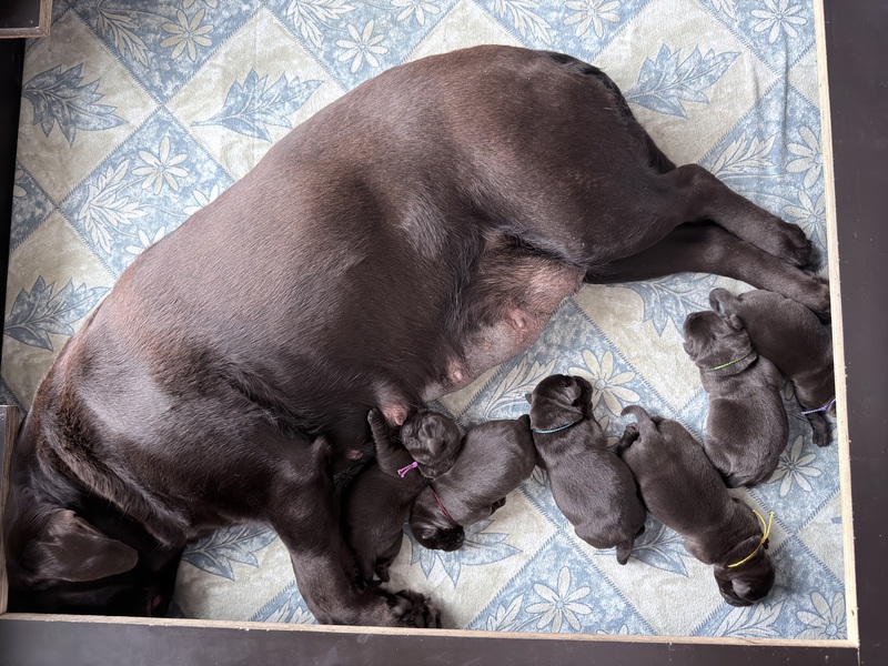 Sowohl Mama als auch die Welpen sind gesund und wohlauf – darüber freuen wir uns sehr. Nun genießen wir erst einmal die ruhige erste Zeit im Welpenzimmer und beobachten gespannt die weitere Entwicklung der kleinen Bande.